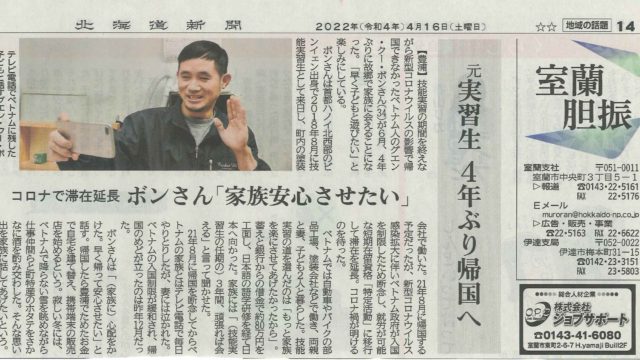 2022.4.中旬 帰国 北海道 企業様名W様 2022.04.18 15:44 北海道の企業様で実習を終えたベトナム人技能実習生が4年ぶりに帰国することが決まり、北海道新聞にこれま... 帰国情報 続きを読む